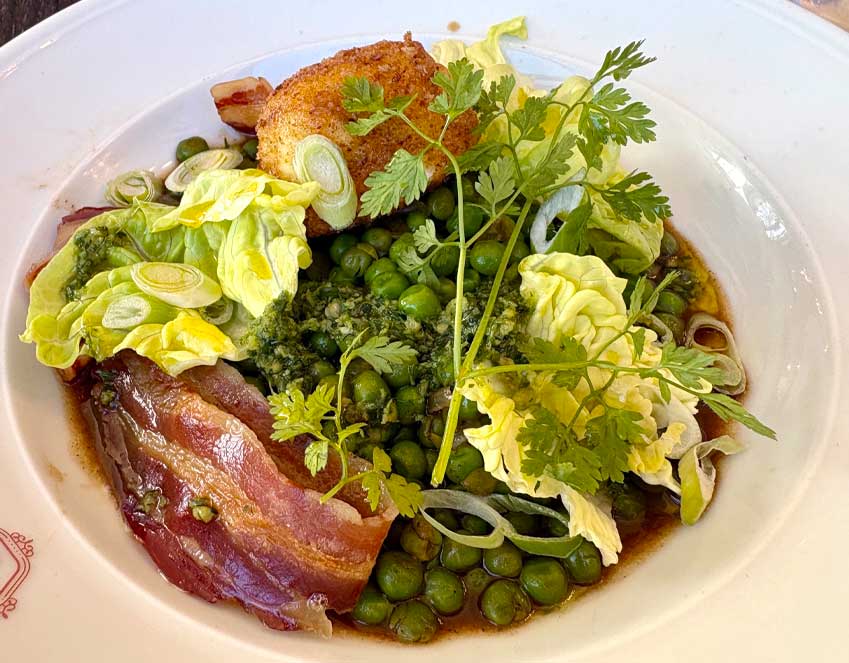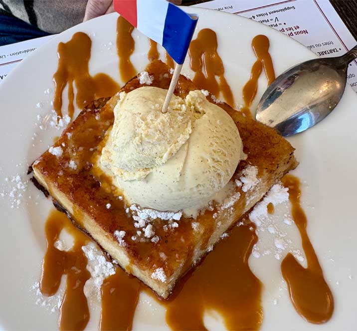 En terrasse au bord de l’eau ou dans la grande salle aux codes de bistrot tricolore, on sera bien installés pour apprécier des recettes goûteuses, tout en fraîcheur, et joliment présentées. Tous les classiques de notre belle cuisine sont là, à l’image du steak tartare de bœuf français « minute », frites fraîches ou salade ; de la savoureuse salade César au poulet croustillant, poitrine grillée et Grana Padano (photo de couverture) ; du croque-madame gratiné au comté, chiffonnade de jambon à la truffe d’été ou de l’aïoli de cabillaud. Mais notre coup de cœur ira vers la bouchée à la reine à la volaille, champignons, quenelles, olives vertes ou encore, en saison, à l’œuf pané, petits pois frais et crispy de poitrine de porc, un délice ! Mais la tradition, c’est aussi l’andouillette AAAAA, l’onglet de bœuf à l’échalote, la blanquette de veau « Grand-mère », le boudin noir aux pommes, les ravioles à la crème de truffe ou le foie de veau à la plancha, jus au vinaigre de Xères et millefeuille de pommes de terre au thym… Tout y est et c’est super bon !