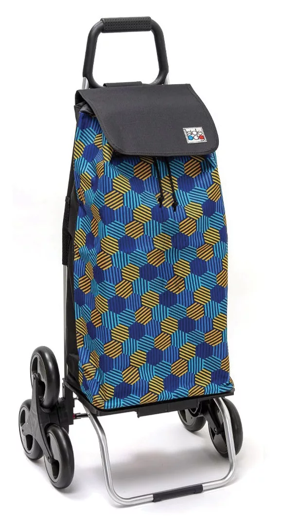 Cette poussette de marché, fabriquée dans le Berry, possède – outre ses différents motifs joyeux, sa grande contenance, sa petite poche zippée à l’arrière et sa toile imperméable – une innovation de la marque : 6 roues pivotantes et une fonction permettant de bloquer leur rotation.