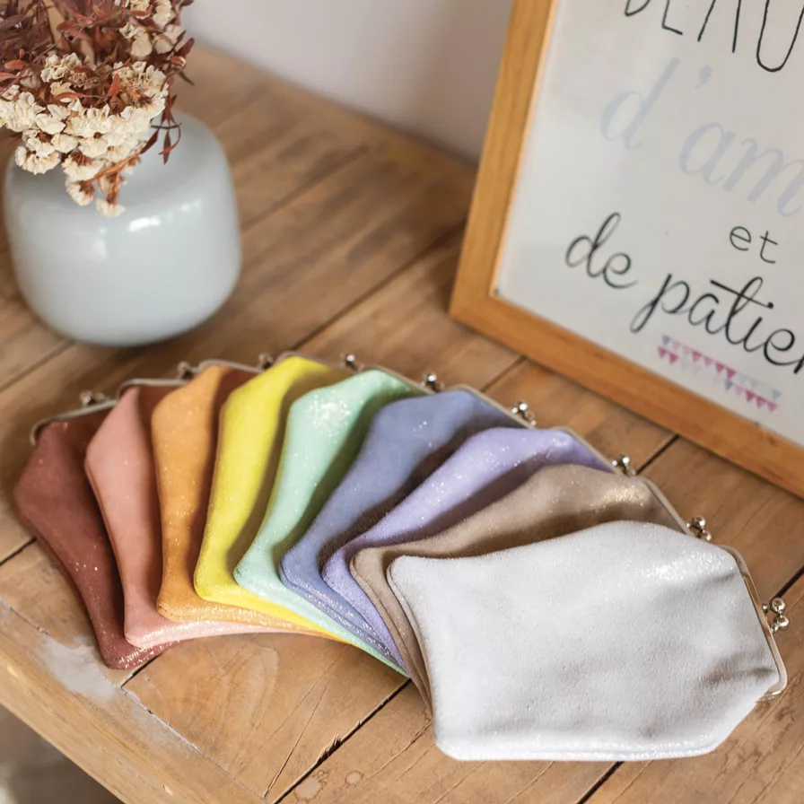 Voici un étui à lunettes au look un brin rétro, avec son cadre et son attache en métal. Confectionné dans un atelier du Tarn, il est fait de cuir de bovin velours (labellisés Oeko Tex, agrémenté de discrètes, mais charmantes paillettes et proposé en différentes couleurs. Il est possible de l’associer au porte-monnaie « Clic-Clac » Mini Reine du même style.