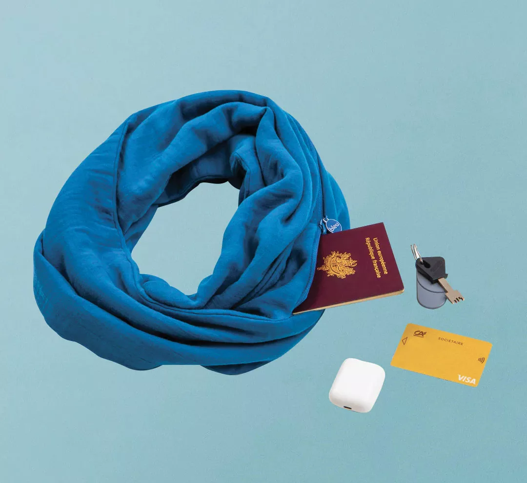 Le deux en un le plus révolutionnaire pour les voyageurs en quête d’ingéniosité et de gain de place. Voici un tour de cou tout doux agrémenté d’un zip dans lequel on peut glisser discrètement toutes nos babioles : papiers, clés, carte bancaire… Et qui, une fois retourné sur lui-même, devient une besace à sangle réglable et amovible, aussi légère que jolie !
