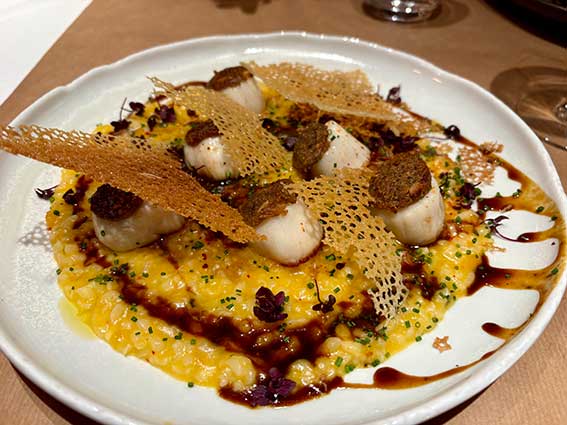 Les Saint-Jacques sont à la fête, grillées et accompagnées d’un petit épeautre très gourmand, tout comme le risotto aux épinards frais, gorgonzola, poire et noix. Le magret de canard n’est pas en reste avec son jus aigre-doux au gingembre, raisin, foie gras et courge, mais on n’oublie pas non plus l’onglet de veau, steak de céleri rôti, béarnaise : quand on vous dit que c’est du gourmand…