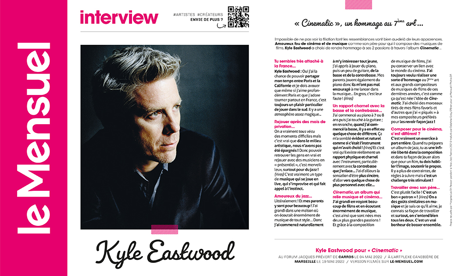 Impossible de ne pas voir la filiation tant les ressemblances vont bien au-delà de leurs apparences. Amoureux fou de cinéma et de musique comme son père pour qui il compose des musiques de films, Kyle Eastwood a choisi de rendre hommage à ses 2 passions à travers l’album Cinematic…
