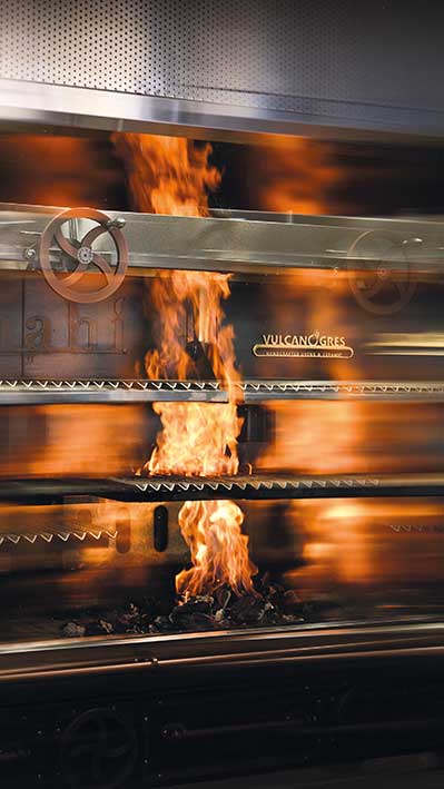 On ne s’attardera pas sur les salades pour passer directement à la viande cuite, évidemment à la braise. Ici, on se régalera de bœuf Black Angus ou de Wagyu, que ce soit en picanha, en bavette, en côte ou en filet mignon à partager autour d’un « gran asado » : les viandes racées sont bien sûr sélectionnées au cordeau par la maison Giraudi. On les accompagnera par exemple de « pimientos de Padrón » doux et savoureux, de classiques « patatas bravas » ou d’aubergines et poivrons brûlés. Daurade ou langouste au barbecue assurent une offre « marine », comme le riz aux gambas cuit sur la braise.