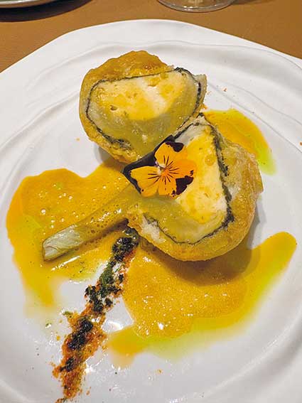 Le mois dernier, il nous a régalé avec son plat signature, un délicieux artichaut poivrade farci d’une mousse de langoustine, au goût iodé et en pâte de beignet… mais le velouté aux champignons tenait également bien la route. Applaudissements aussi pour le dos de loup clouté au citron, accompagné d’un rouleau de printemps au chou chinois et légumes du moment, sans oublier les gourmandes Saint-Jacques en croûte de truffe, endives caramélisées et bouillon safrané. Belle tradition toujours côté viandes avec la côte de veau double, rôtie en cocotte, pressé de céleri rave, sauce arabica ou le filet de bœuf aux cèpes, sauce foie gras : la présentation délicate et épurée n’enlève évidemment rien aux saveurs bien marquées. Au dessert, le soufflé au chocolat, crème glacée pistache ou le mille-feuille ananas, sorbet coco sont de vrais instants de bonheur.