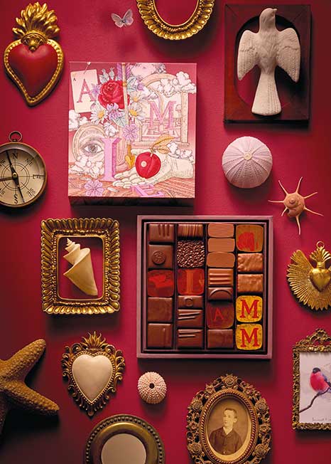 Pierre Hermé conjugue « aimer » à l’infini ! Pour sa collection Saint-Valentin, le pâtissier dialogue avec l’illustratrice Julie Serre pour imaginer une atmosphère surréaliste et insolite. Entre fantaisie, onirisme et narration, on se laisse porter par le dessin au trait fin, précis, où chaque élément se lie dans une composition abstraite, foisonnante et intrigante autour du mot AIME. Macarons, bonbons au chocolat, et pâtisseries déclinent ainsi cette création généreuse… et délicieuse.