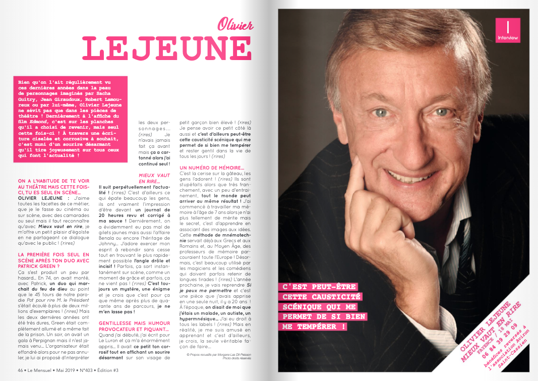 OLIVIER LEJEUNE : J’aime toutes les facettes de ce métier, que je le fasse au cinéma ou sur scène, avec des camarades ou seul mais il faut reconnaître qu’avec Mieux vaut en rire, je m’offre un petit plaisir d’égoïste en ne partageant ce dialogue qu’avec le public ! (rires)
