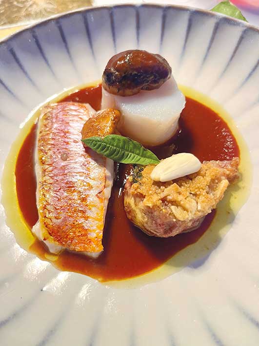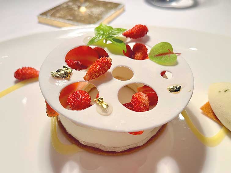 Cet été, il nous a à nouveau bluffés avec ses « makis de paella » aux langoustines, jus d’os ibérique et rillettes de sardines ; avec le galet de foie gras glacé et chutney aux fruits ; avec le maigre – du pêcheur Daniel – à la figue rôtie et amandes fraîches ou la côte d’agneau juste cuisinée mais magnifiée par un condiment dattes, figues, cumin, raisins, harissa douce et taboulé… sans parler du cheesecake vanille citron avoine aux fruits rouges, gavottes croustillantes et sorbet verveine !