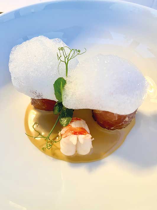 Cet automne, on se régalera d’un velouté et pulpe de potimarron, mousseline de lard paysan, foie gras fumé et cèpe caramélisé ; d’un loup de Méditerranée en croûte d’aubergine et jus quatre-quarts ; d’un filet de veau rôti aux aromates et crème de thon, ravioli de burrata à la sauge, jus d’un rôti ; et au dessert, d’un royal Gianduja, céréales craquantes au praliné et noisettes dorées : du grand art que la vue magique sur Saint Paul vient encore sublimer.