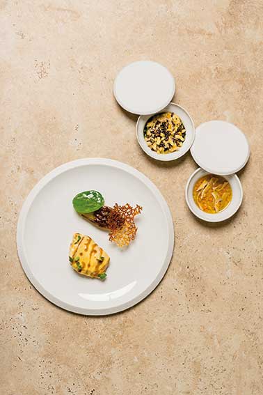 Les amateurs se régaleront ensuite du chou rouge, pigeon fumé et condiment cacahuètes torréfiées au tamarin (datte indienne) et réduction salmis jus de betterave ; des topinambours caramélisés, condiment fumé, glaçage et marmelade de comté, poire et chistorra (saucisse sèche) ; du céleri confit, volaille à l’étouffée, cuisses confites, bouillon de poule au pot ; ou de la pomme de terre et laitue de mer, lieu jaune Ikejime (la version haut de gamme du lieu) confit dans un bouillon d’algues, beurre nantais et extraction florale…