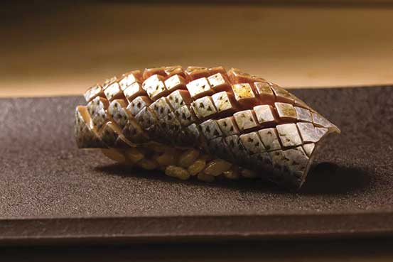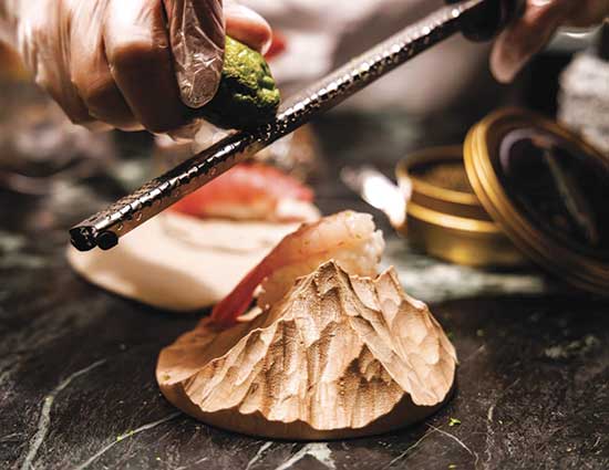 La formule « omakase » permet un échange direct avec le chef et son adjointe Geneviève. Thon, saumon, daurade ou autres poissons sont sélectionnés avec exigence, le bœuf wagyu ou kobe arrive tout droit du Japon : les produits, la découpe, la température, tout participe à l’équilibre du moment. Nigiris, sashimis, sushis, rolls défilent au garde-à-vous, impeccables, avec parfois des touches raffinées de truffe ou de caviar…