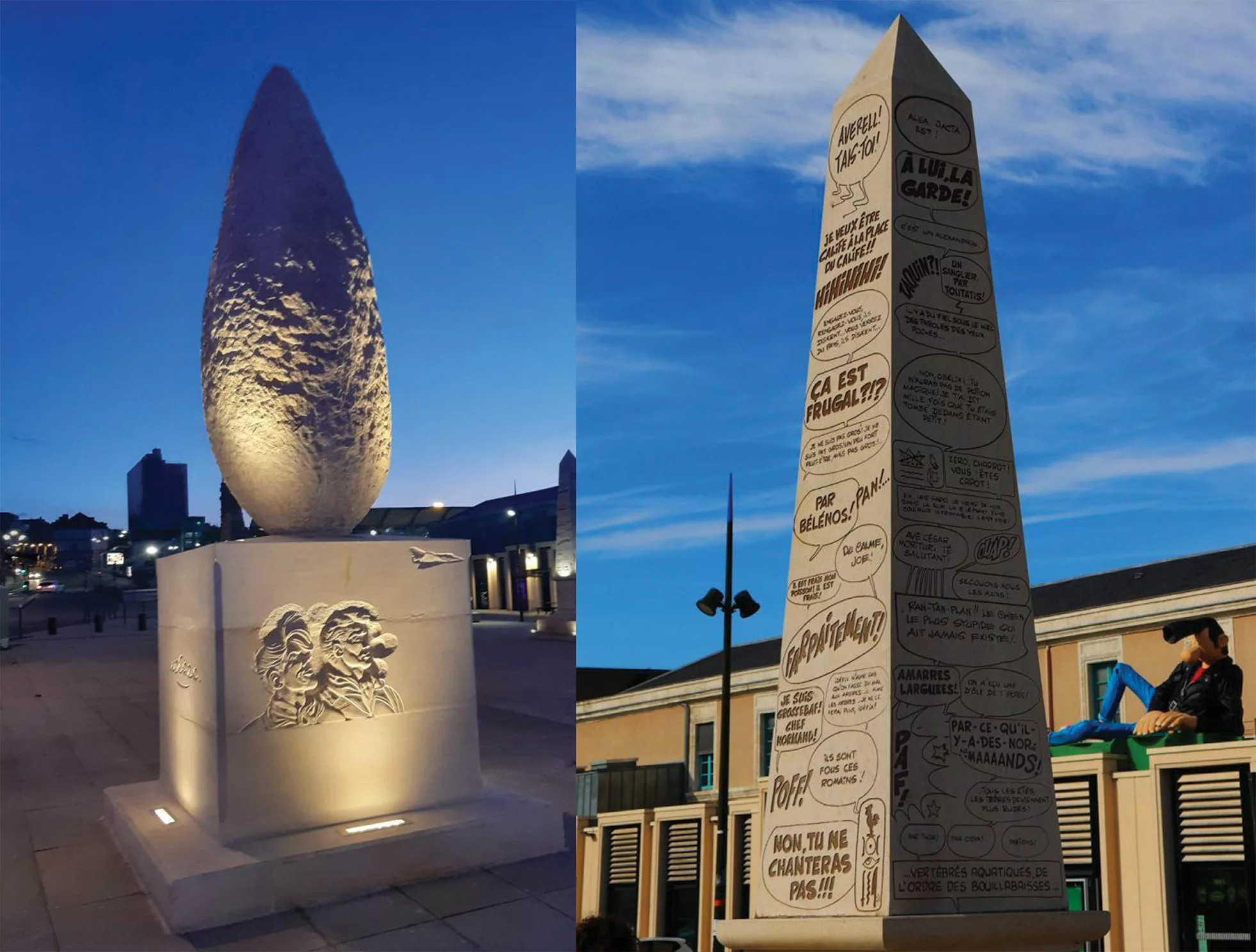 Enfin, s’il est vrai qu’il ne s’agit pas ici de fresque murale, deux créations tout aussi dignes d’un voyage au cœur d’album de BD s’observent sur le parvis de la gare. Un obélisque et un menhir, qui semblent tout droit sortis des aventures d’Astérix le Gaulois, sont fièrement érigés à la mémoire des artistes Uderzo et Goscinny.