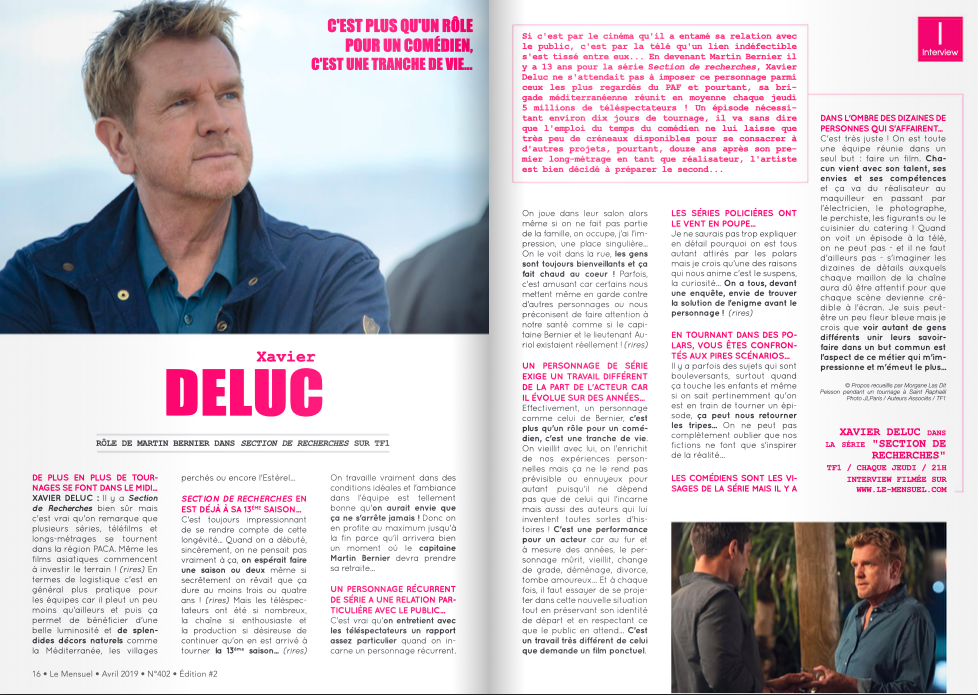 Si c’est par le cinéma qu’il a entamé sa relation avec le public, c’est par la télé qu’un lien indéfectible s’est tissé entre eux… En devenant Martin Bernier il y a 13 ans pour la série Section de recherches, Xavier Deluc ne s’attendait pas à imposer ce personnage parmi ceux les plus regardés du PAF et pourtant, sa brigade méditerranéenne réunit en moyenne chaque jeudi 5 millions de téléspectateurs ! Un épisode nécessitant environ dix jours de tournage, il va sans dire que l’emploi du temps du comédien ne lui laisse que très peu de créneaux disponibles pour se consacrer à d’autres projets, pourtant, douze ans après son premier long-métrage en tant que réalisateur, l’artiste est bien décidé à préparer le second…